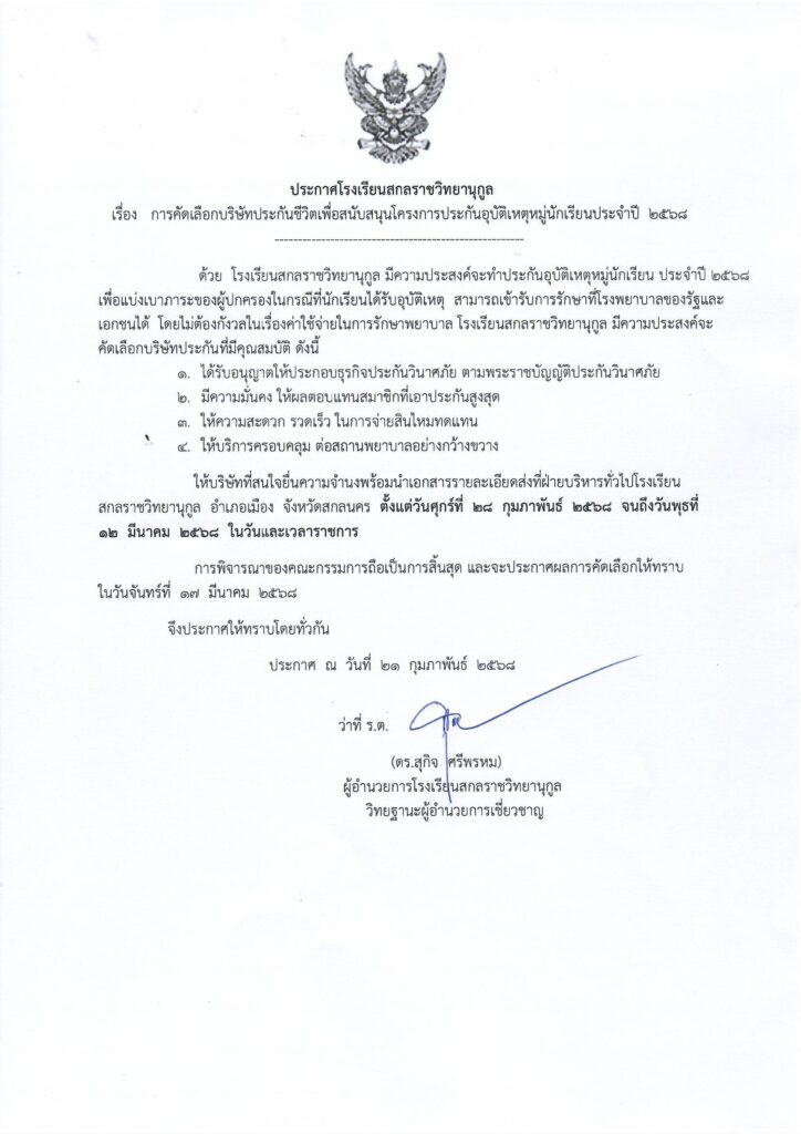 ประกาศการคัดเลือกบริษัทประกันชีวิตเพื่อสนับสนุน โครงการประกันอุบัติเหตุหมู่นักเรียนประจำปี 2568 SKR Website งานเว็บไซต์ โรงเรียนสกลราชวิทยานุกูล