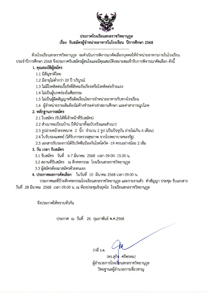 ประกาศรับสมัครผู้จำหน่ายอาหารในโรงเรียน ปีการศึกษา 2568 SKR Website งานเว็บไซต์ โรงเรียนสกลราชวิทยานุกูล