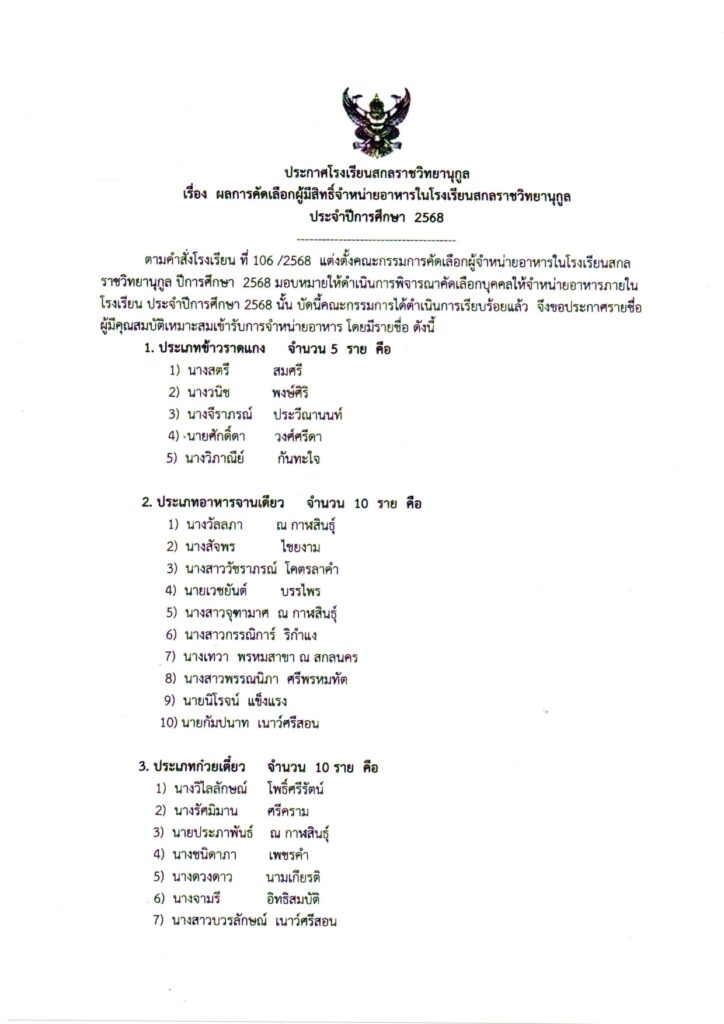 ประกาศผลการคัดเลือกผู้มีสิทธิ์จำหน่ายอาหารในโรงเรียนสกลราชวิทยานุกูล ประจำปีการศึกษา 2568